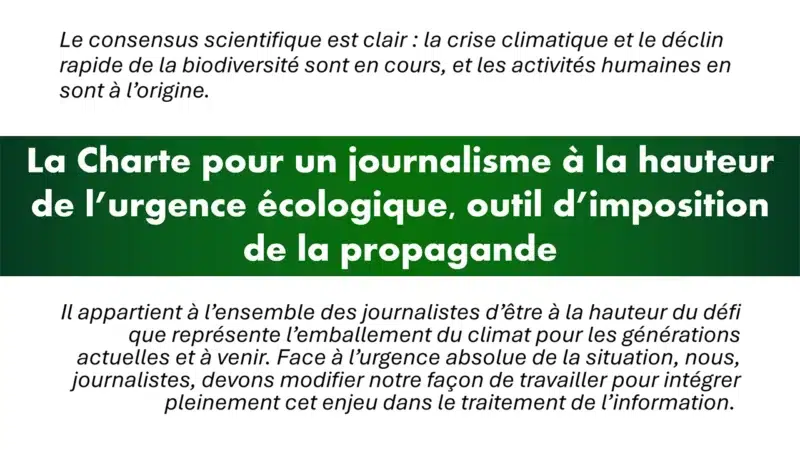 Elle demande aux journalistes de « révéler les stratégies produites pour semer le doute dans l’esprit du public », ce qui est littéralement une invitation à fustiger tous ceux qui s’éloignent d’un discours unique : c’est de la propagande. Il faut aussi « bien choisir les mots afin de décrire les faits avec précision et rendre compte de l’urgence », les deux étant parfois, vous le verrez aujourd’hui, absolument antithétiques. La charte implique d’ailleurs de surveiller « la propagation de fausses informations qui relativisent les faits ».