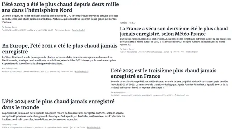 Ces articles contiennent parfois certaines approximations : prenons l’été 2021, le plus chaud jamais enregistré en Europe. Audrey Garric explique que, selon l’institut Copernicus, « les sept dernières années ont été les plus chaudes jamais enregistrées ». 2021 se classerait… « à la 6e ou à la 7e place ». Ce qui ne correspond pas au plus chaud jamais enregistré.