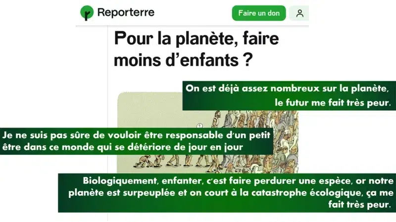 « Même si on devient vegan, qu’on vend sa voiture et qu’on ne prend plus l’avion, ça ne suffit pas. Avoir envie d’un petit être pour soi, ce n’est ni un don de soi ni un don pour la planète. Il faut inverser le raisonnement ! » – ces propos sont ceux d’une militante d’Extinction Rebellion de 28 ans.