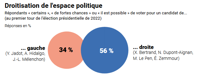 Par exemple, 37 % des électeurs se situent eux-mêmes à droite de l’échiquier politique contre 33 % en 2017, soit une progression de 4 points.