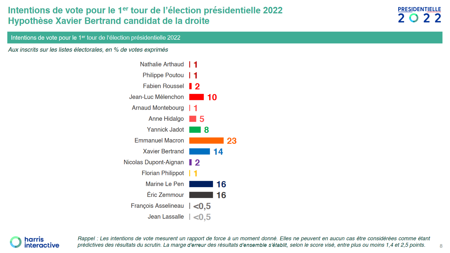 D’abord, si 56 % des Français se disent prêts à voter à droite, LR compris, il convient de rappeler que Xavier Bertrand ou tout autre candidat de LR n’est bien entendu que cosmétiquement de droite et que peu de chose dans le programme de ce parti ou dans l’attitude de ses représentants pourrait lui permettre d’être qualifié de droite.