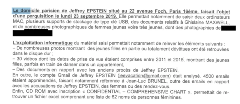 Plusieurs années après, on ne sait toujours pas quels sont les objets qui ont été saisis et quelles sont les constatations faites par les policiers au moment de cette perquisition. En revanche, on sait désormais que la perquisition de l’appartement de Jeffrey Epstein a eu lieu le 23 septembre 2019… soit des mois après l’arrestation du financier, arrêté en juillet 2019 en rentrant justement de Paris.