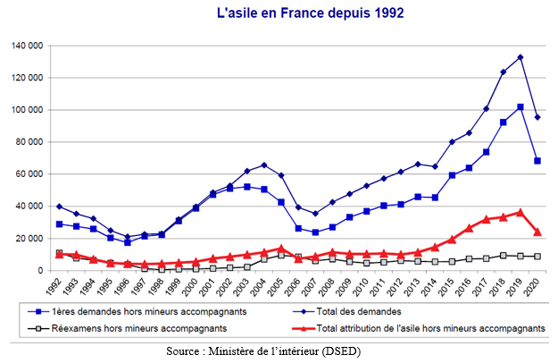 Tombées à 96 000 en 2020 à la faveur de la crise sanitaire après 132 000 en 2019, les demandes d’asile remontent à 103 000 en 2021[3].
