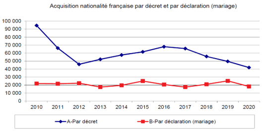 Au cours des dix dernières années, les naturalisations (acquisition par décret) fluctuent entre 50 et 100 000 selon les années (75 000 en 2021, graphique ci-dessous jusqu’en 2020), ce qui n’est pas négligeable au regard des flux habituels de premiers titres de séjour (décalés d’au moins cinq ans puisque la naturalisation ne peut intervenir qu’après un minimum de 5 ans de résidence en France). Les acquisitions sont plus stables aux alentours de 50 000 personnes par an.