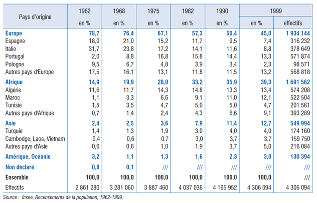 Naturellement, ce qui compte, ce n’est pas seulement le nombre des immigrés, c’est aussi leur origine géographique. L’Insee précise que : « En 2021, 47,5 % des immigrés vivant en France sont nés en Afrique. 33,1 % sont nés en Europe. Les pays de naissance les plus fréquents des immigrés sont l’Algérie (12,7 %), le Maroc (12 %), le Portugal (8,6 %), la Tunisie (4,5 %), l’Italie (4,1 %), la Turquie (3,6 %) et l’Espagne (3,5 %). La moitié des immigrés sont originaires d’un de ces sept pays (49 %). » En 1962, les originaires d’Italie étaient encore les plus nombreux : ils représentaient 32 % de la population immigrée, devant les immigrés venus d’Espagne, d’Algérie et de Pologne. De 1962 à 1999, la part des immigrés présents en France venus de l’ensemble de l’Europe a baissé constamment passant de 78,7% à 45,0 %.